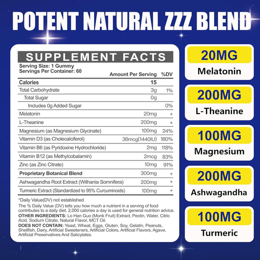Maenniliy Melatonina 20Mg Con L-teanina, Magnesio, Ashwagandha, Cúrcuma, D3 60 Gomitas